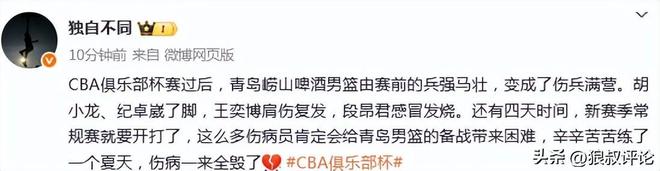 媒体人“独自不同”发文点评:“CBA俱乐部杯赛过后,青岛崂山啤酒男篮由赛前的兵强马壮,变成了伤兵满营。胡小龙、纪卓崴了脚,王奕博肩伤复发,段昂君感冒发烧。还有四天时间,新赛季常规赛就要开打了,这么多伤病员肯定会给青岛男篮的备战带来困难,辛辛苦苦练了一个夏天,伤病一来全毁了”。